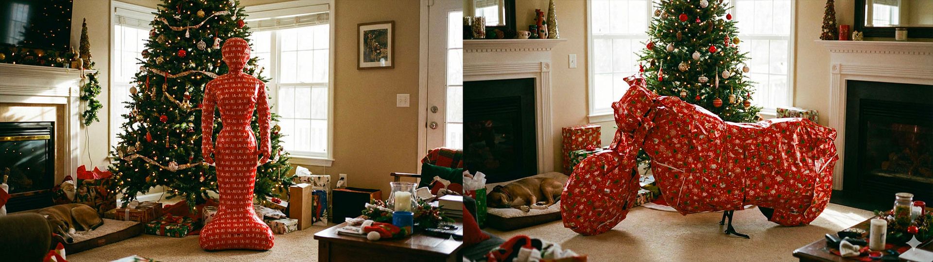 “Crea una escena realista de unos regalos debajo del árbol de Navidad. En el centro hay [regalo imposible] envuelto perfectamente en papel [color y descripción]. El papel de regalo se adapta perfectamente a la forma del regalo. La iluminación debe ser natural y acogedora.” Visto en x. Image sources: Nano Banana Pro / IA-AI Newsletter