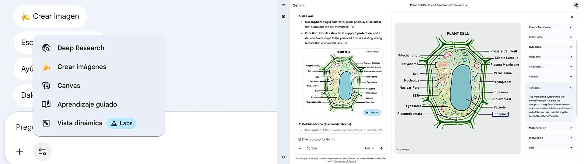 GEMINI AÑADE LA CAPACIDAD DE CREAR IMÁGENES INTERACTIVAS Convierte diagramas e imágenes en elementos interactivos, permitiendo tocar zonas concretas para obtener explicaciones contextuales dentro de la propia app. Pensada sobre todo para educación y aprendizaje visual, puede usarse, por ejemplo, en un aula para explicar la anatomía de una célula: el profesor genera un diagrama interactivo y los alumnos exploran cada parte tocando sus componentes para ver definiciones, funciones y ejemplos sin salir de la imagen. Dynamic View (Vista dinámica) es la tecnología o herramienta que lo hace posible. Al tratarse de una función de Labs, su disponibilidad no es consistente: algunas cuentas la tienen activa y otras no, sin que exista una relación clara con el tipo de plan, ya sea gratuito o de pago. x
