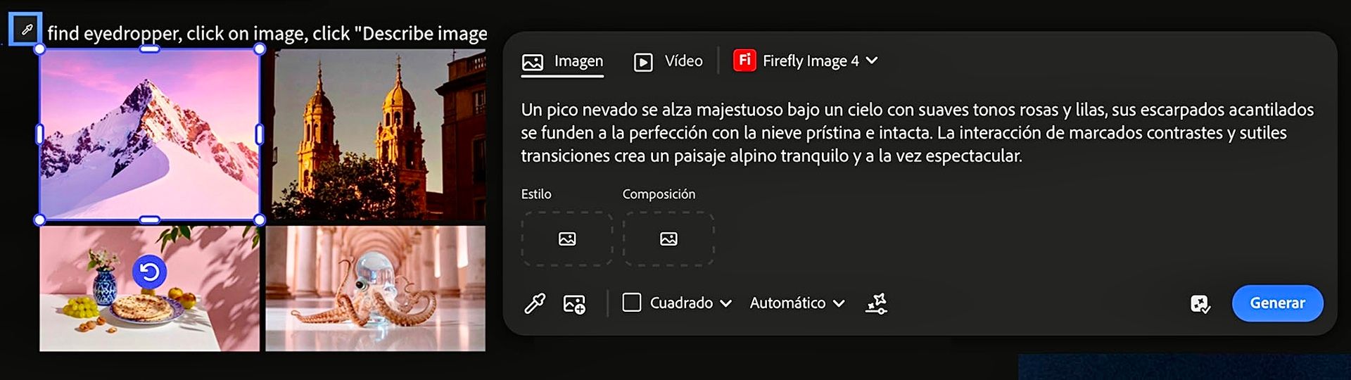 ADOBE FIREFLY BOARDS ahora facilita traducir visuales en descripciones textuales contextualizadas, ayudando a generar prompts efectivos sin empezar de cero. Para usarlo solo hay que añadir la imagen al lienzo, seleccionar el cuentagotas, elegir la imagen y hacer clic en “Describe image” para luego experimentar y remezclar. Si tienes cuenta de Adobe pruébalo aquí. También podrás probar el modelo Gemini 2.5 Flash Image con 20 créditos de cortesía.