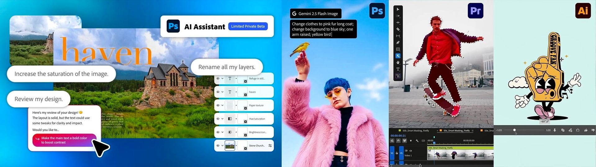 AI Assistants en Creative Cloud (Photoshop, Express, Firefly): asistentes conversacionales impulsados por IA que permiten ejecutar tareas, recibir recomendaciones y tutoriales.