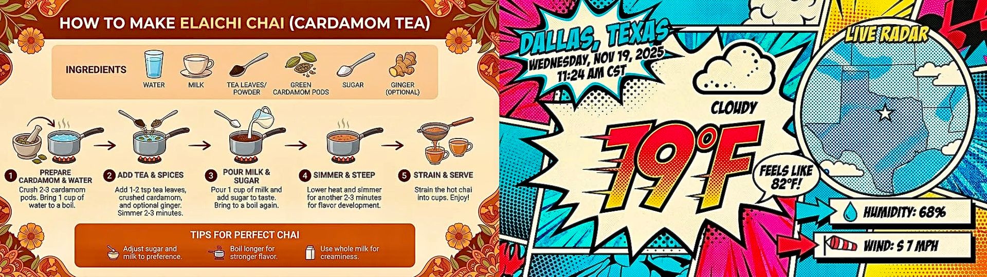 ◀️ Infografía paso a paso para preparar té de cardamomo, que demuestra la capacidad de visualizar recetas e información práctica. Prompt: Crea una infografía que muestre cómo preparar té de cardamomo. ▶️ Información meteorológica en tiempo real a través de Search Grounding con petición de crear una infografía estilo pop-art. Image Credits: Google