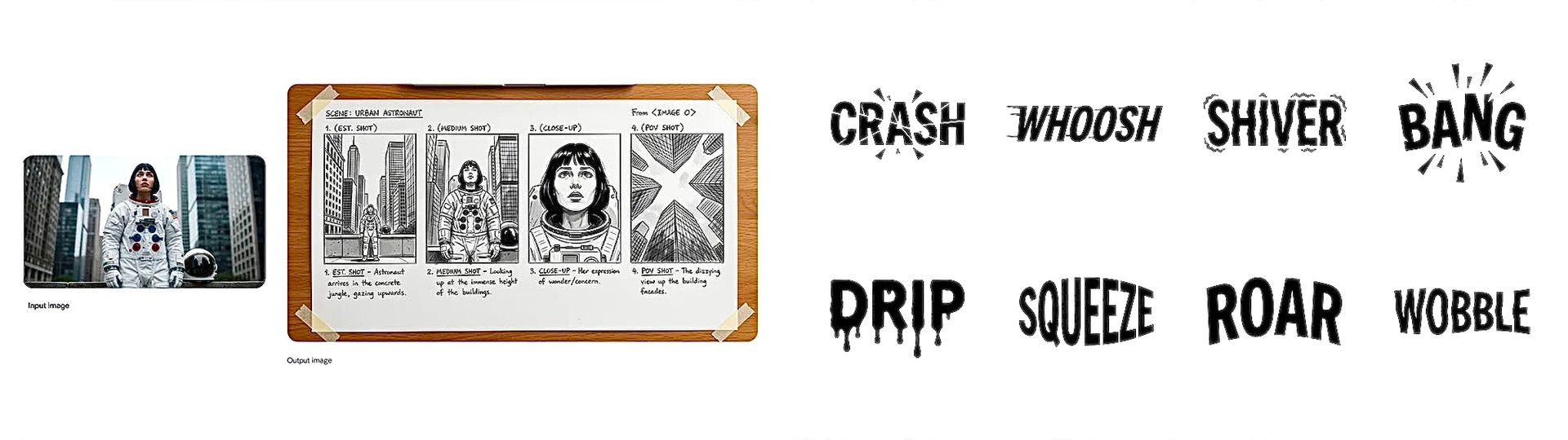 ◀️ Boceto en blanco y negro del storyboard que muestra un plano general, un plano medio, un primer plano y un plano subjetivo para una escena de película. Prompt: Crea un storyboard para esta escena. ▶️ Caligrafía inspirada en el significado, que muestra la capacidad de generar texto expresivo con una amplia variedad de estilos y fuentes. Prompt: Crea 8 logotipos minimalistas, cada uno con una palabra expresiva, y haz que las letras transmitan un mensaje o sonido visualmente para expresar el significado de dicha palabra de forma impactante. Composición: Representación vectorial plana de todos los logotipos en negro sobre un fondo blanco. Image Credits: Google