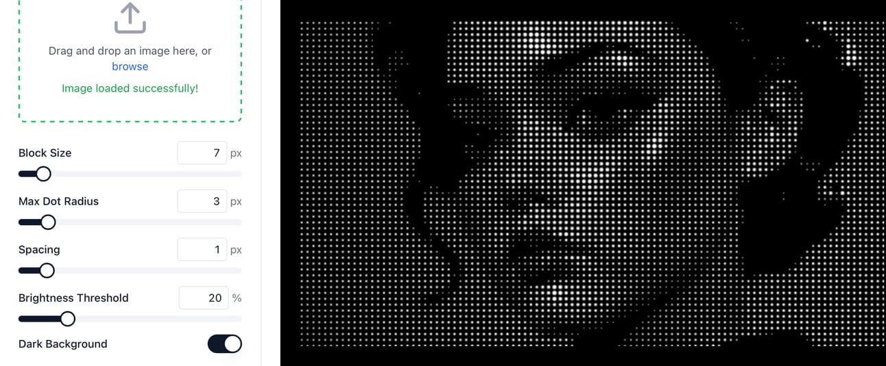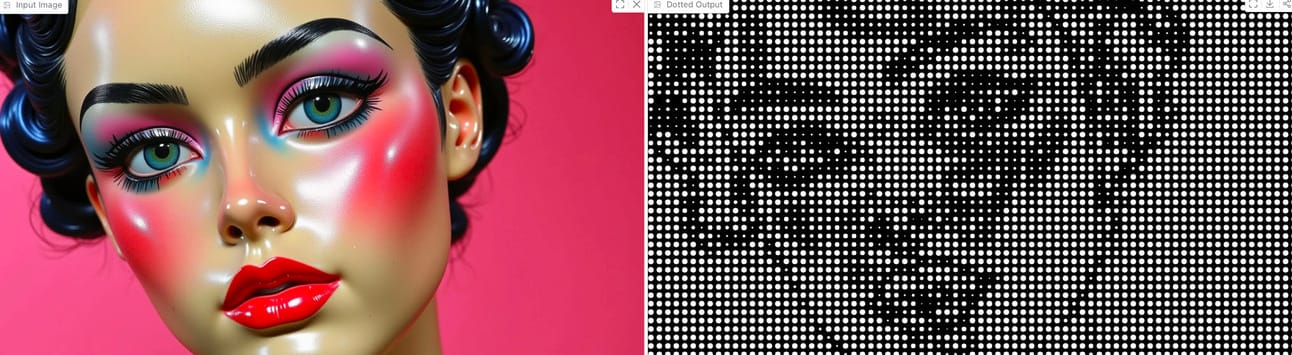 Dotted Image Effect Un usuario construyó en ChatGPT una herramienta que imita el estilo de las imágenes halftone del anuncio de OpenAI en la Súper Bowl. Quizás porque siempre hemos sido fans de los dots, esta es la herramienta más chula que hemos visto desde hace tiempo. Lo mejor es que los puntos son totalmente personalizables visualizando el resultado al instante. ¡Adobe Photoshop & Illustrator, tomar nota por favor! Por cierto, nosotros ya hicimos algo parecido hace muchos meses solo pidiéndole a ChatGPT que lo hiciera. Eso sí, tras varias iteraciones.
