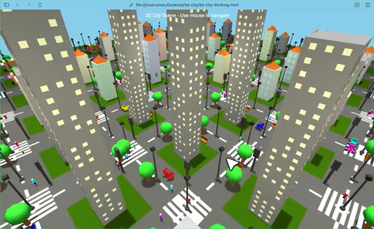 Simulación de una ciudad con rascacielos, coches en movimiento y ciclos de día/noche creado por un usuario con Claude 3.7 Sonnet. Espectacular