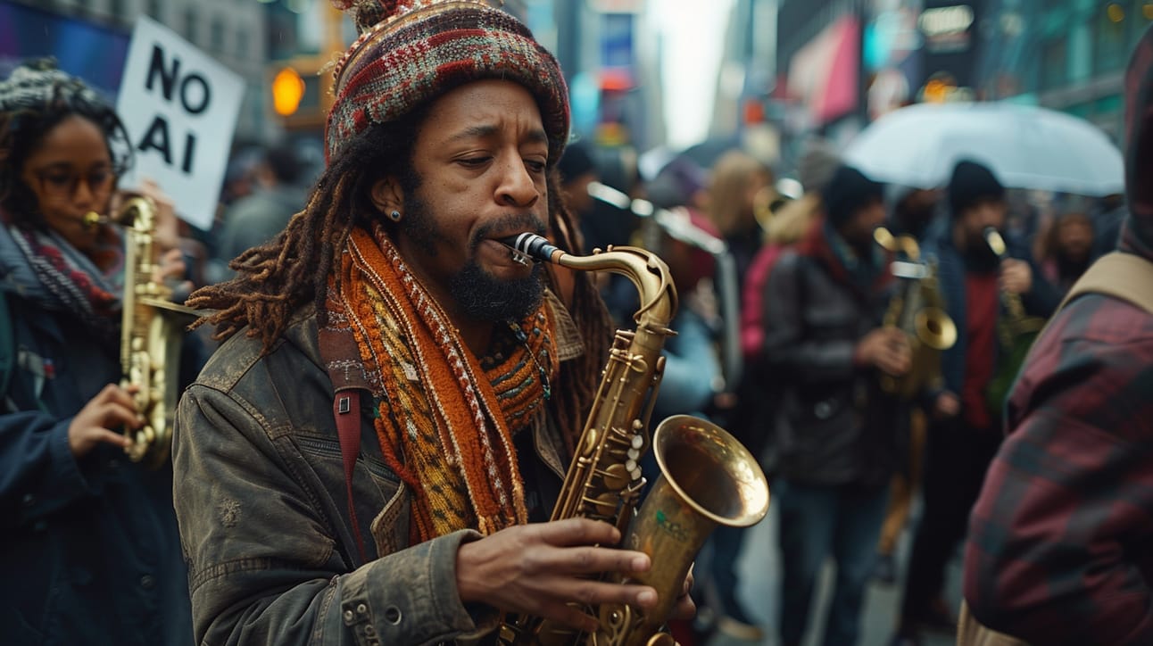 Los músicos se manifiestan contra la IA mal empleada. Made with AI, Midjourney v6