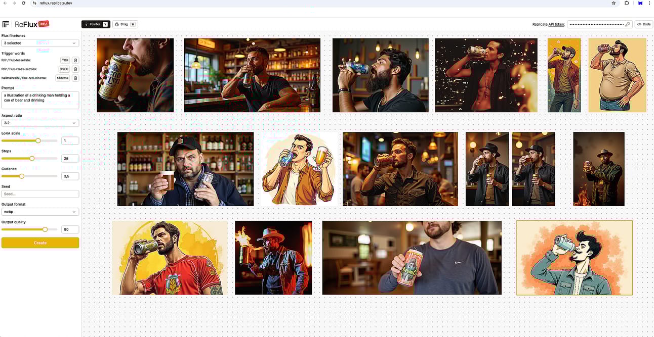 Reflux, una interfaz experimental en modo beta que te permite utilizar múltiples modelos FLUX.1 afinados y generar imágenes en un lienzo infinito. Puedes explorar varios estilos y conceptos simultáneamente, abriendo nuevas posibilidades creativas. Tal y como te indica la página necesitarás crear un “Replicate API token”. La creas y la pegas sin más. Al ser una versión beta tiene errores. Por ejemplo en muchos casos teníamos que recargar la página para visualizar las imágenes.