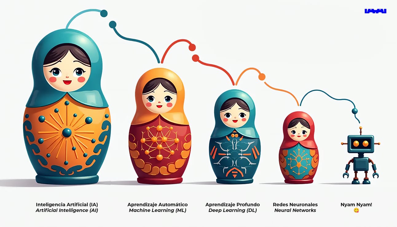 Deep Learning (DL) - La tercera muñeca más pequeña: es una rama específica del Machine Learning. Utiliza redes neuronales artificiales con múltiples capas (de ahí lo de ‘deep’) para analizar datos complejos. Es como un niño que aprende a reconocer objetos: al principio confunde un perro con un gato, pero con la práctica y muchos ejemplos, aprende a distinguirlos. Un ejemplo de DL es el reconocimiento facial en fotos de Facebook.